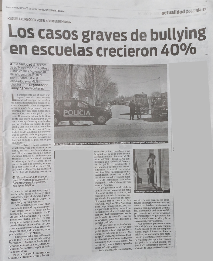 Quiero compartir para los lectores, sobre la Nota periodística del diario El Popular titulada “los casos graves de bullyIng en las Escuelas crecieron 40 %”.
