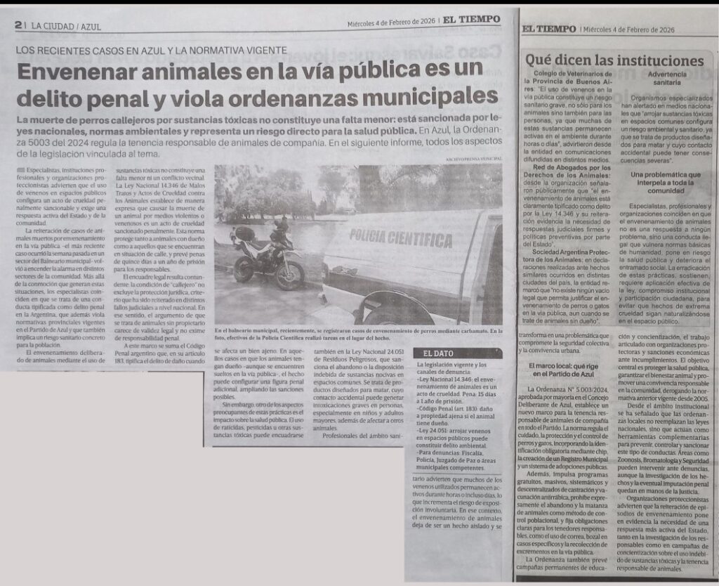 De este articulo tomado del Diario El Tiempo, de la ciudad de Azul, se desprende del mismo, lo que abarca un amplio abanico que involucra a todas las Profesiones de diversas especialidades, Instituciones profesionales y Proteccionistas de todos los orígenes. Pero desde el punto de vista mediático en general y en especial de la Psiquiatría, quiero hacer una semblanza del Perfil de Personalidad de estos individuos. Lamentablemente, y en varias oportunidades lo he expresado, ni siquiera entra en las clasificaciones de Trastornos severos, porque éstos, los que padecen una enfermedad mental, es muy raro que tengan una actitud destructiva perversa como son los envenenadores. Éstos de por sí, son perversos, carentes de todo sentimiento, solo se les ocurre, ni siquiera piensan que pueden destruir hasta a sus propios familiares, a un hijo, a un nieto, o un familiar. Simplemente el Odio y la Destrucción son tan profundos que no contemplan este sentimiento. Porque se supone que algún familiar cercano quieren a los animales, a los perros, a los gatos, a lo que fuese.