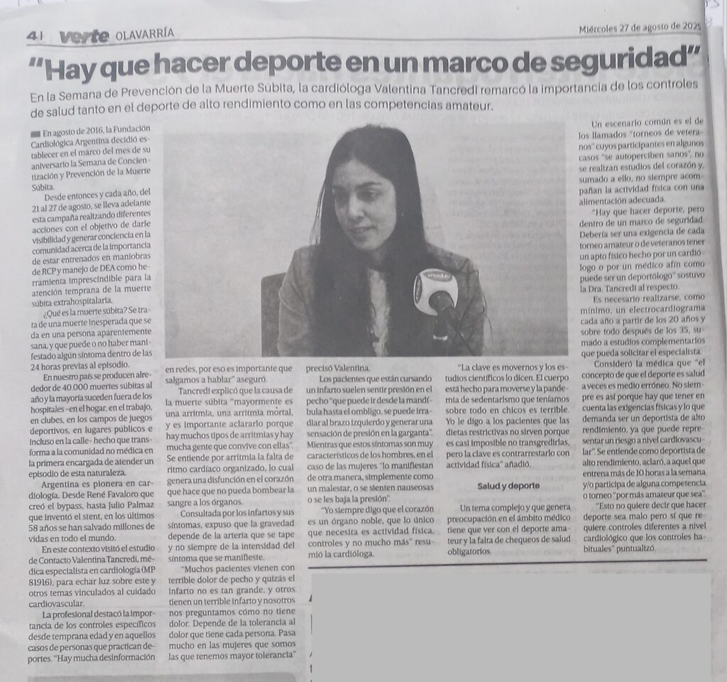 Como también Médico Clínico, quiero compartir esta Nota del “Diario Verte” del día 27 de Agosto donde la Dra. Valentina Tancredi, remarca la importancia de los controles de Salud en Deportes y Competencias. Es muy atinada en los aportes que ha hecho en la misma. Pero en mi experiencia, si bien no soy especialista en Cardiología, me dedico a la parte Psiquiatrica, Psicológica y Sexológica, y siempre en la misma con los Pacientes hablamos de sus situaciones físicas, de sus actividades, de los beneficios de las mismas, pero todo eso en su justa medida.