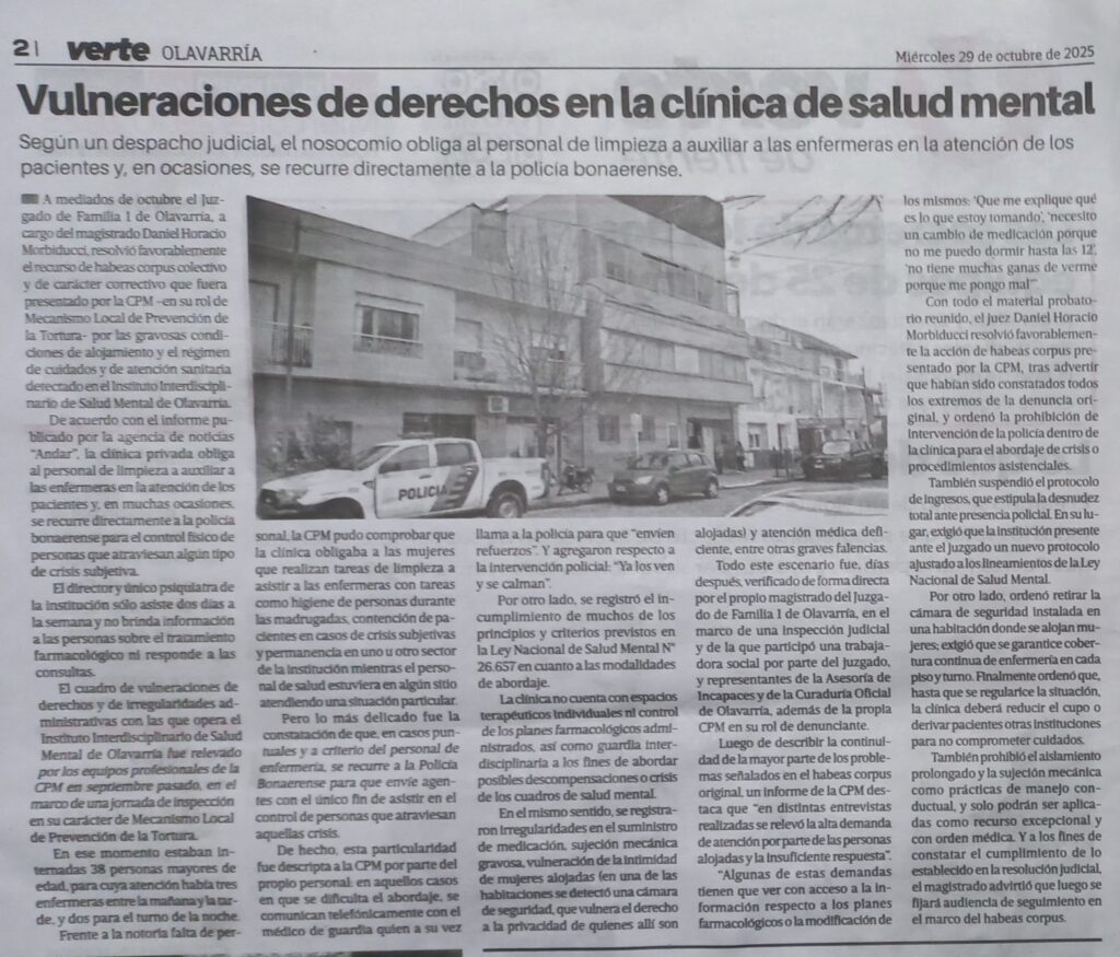 Lamento como Médico, como Psiquiatra, estas situaciones de lo acontecido en una nota periodística. Me siento un poco con autoridad, si bien han pasado muchos años, me he formado en un Servicio Psiquiátrico de Azul anexado al Hospital Pinto, dependiente de la Pcia. de Bs. As., donde estaban las otras Especialidades Médicas de toda índole para situaciones clínicas que pudieran acontecer con los Pacientes. Era un Servicio de ambos sexos, 14 camas para mujeres, 14 camas para varones, había 3 Médicos de Planta entendidos en Psiquiatría, permanente, más la Dirección, una variante de 8 a 12 Médicos Residentes para especializarse en la Especialidad de Psiquiatría.